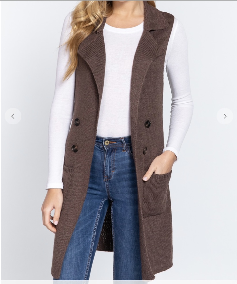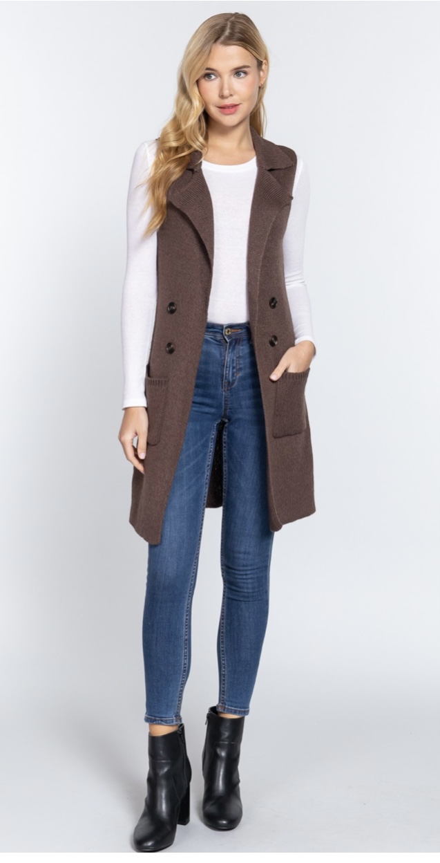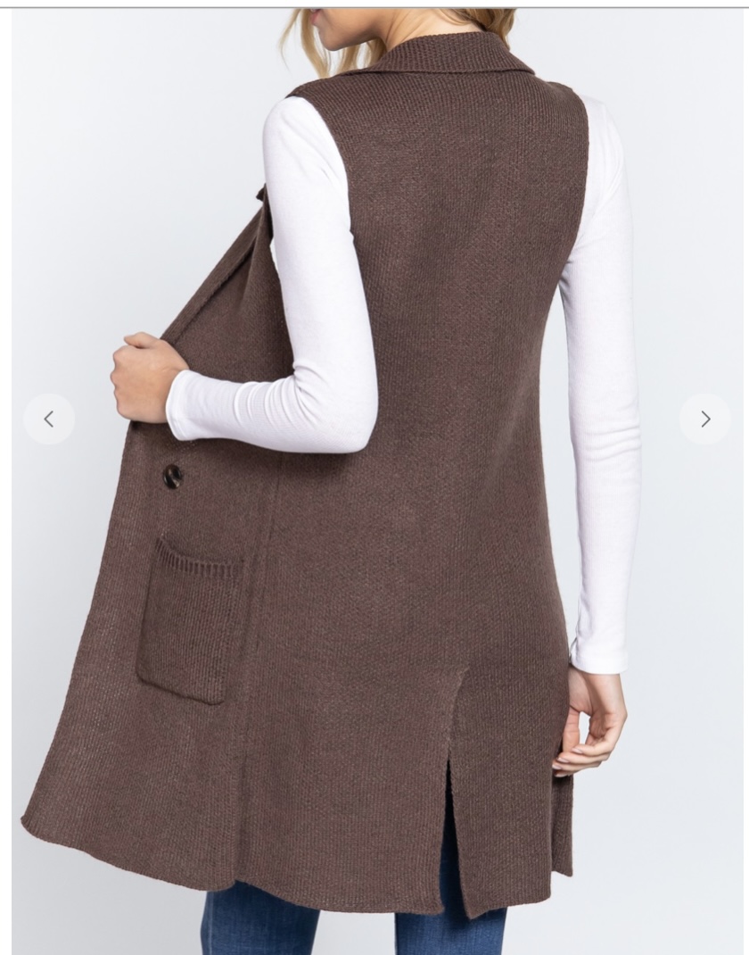 SLEEVELESS NOTCHED COLLAR WITH SIDE POCKET LONG SWEATER VEST IN COCOA BROWN