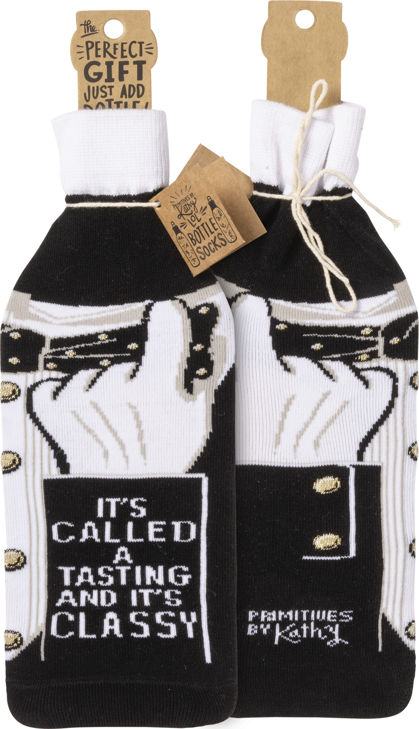 A creative alternative for a traditional gift bag, this washable and re-usable knit bottle sock features an "It's Called A Tasting And It's Classy" sentiment. Works great as a decorative accent on an empty bottle well.