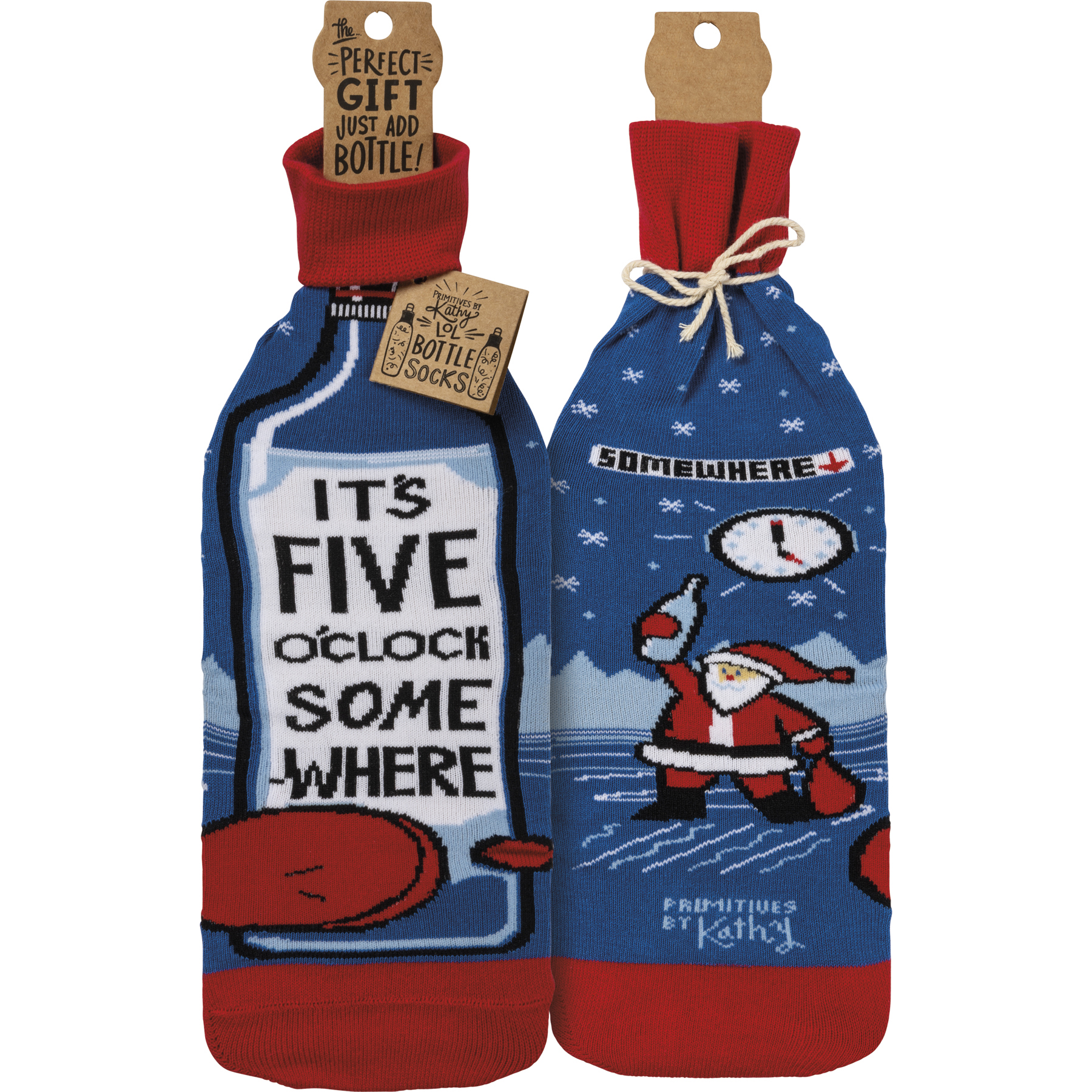 A creative alternative to a traditional gift bag, this washable and reusable knit bottle sock features an "It's Five O'Clock Somewhere" sentiment with an illustration of Santa holding a bottle in his hand, standing under a banner that reads "Somewhere". Hangtag doubles as a gift tag.