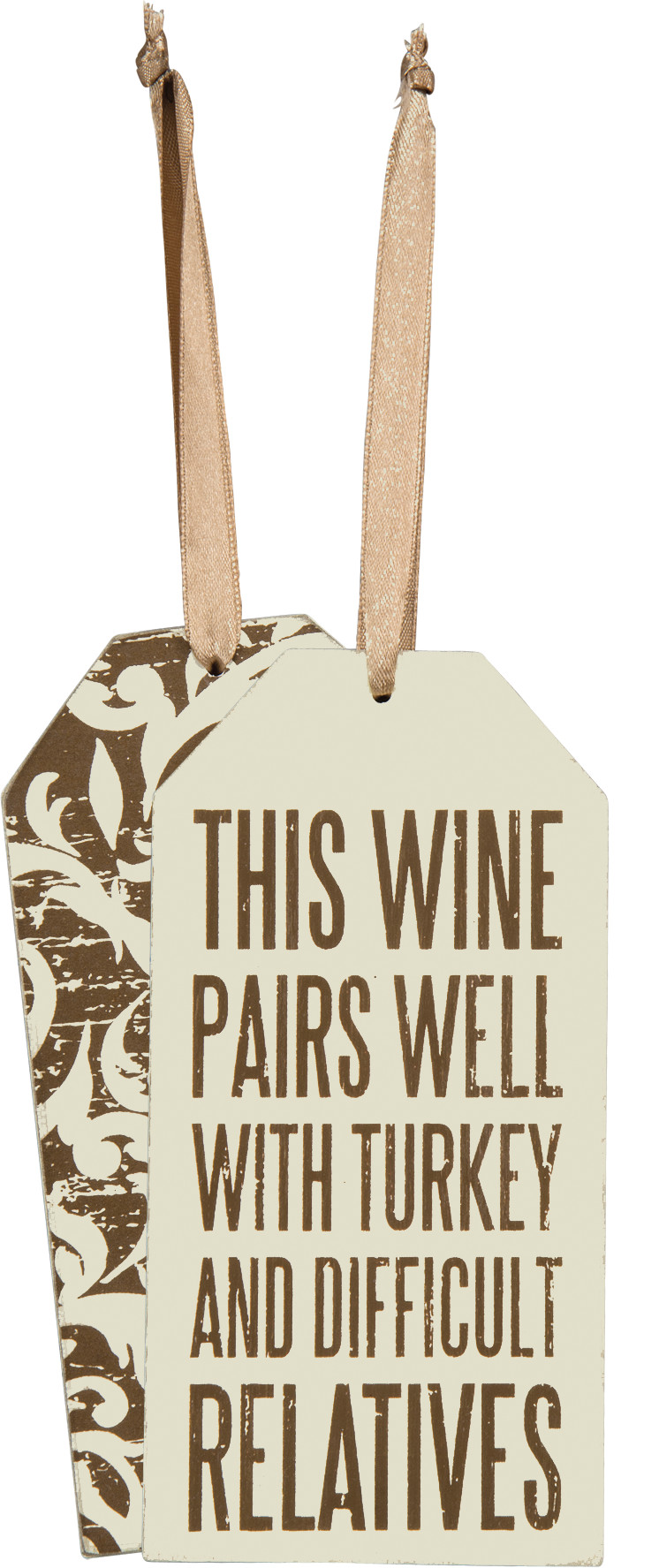 A brown and white wooden bottle tag featuring a distressed "This Wine Pairs Well With Turkey And Difficult Relatives" sentiment with reverse designs. Contains top fabric loop for attaching to a bottle of wine.