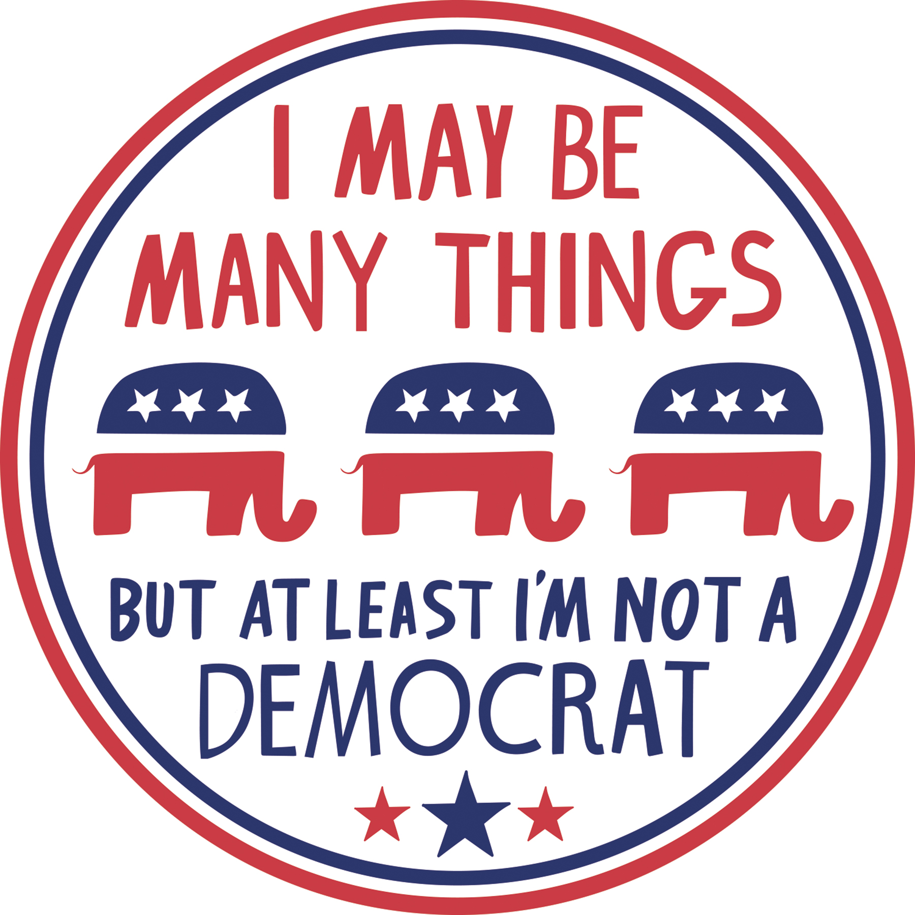A car magnet featuring a patriotic design and "I May Be Many Things But At Least I'm Not A Democrat" sentiment on a white palette. Magnet is waterproof, UV protected, and ultra-strong.