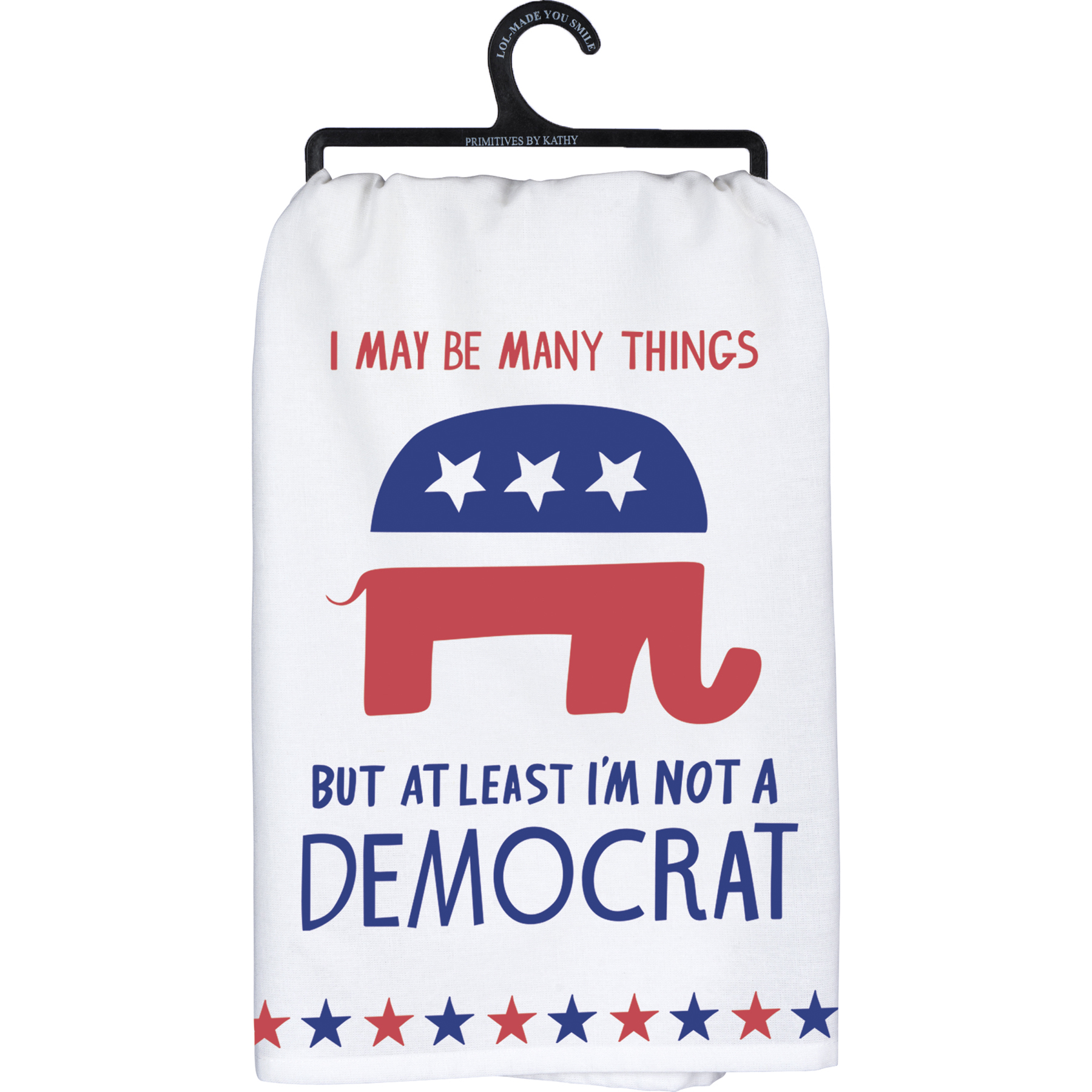 A cotton dish towel featuring star designs and a patriotic palette with "I May Be Many Things But At Least I'm Not A Democrat" sentiment. Machine-washable.