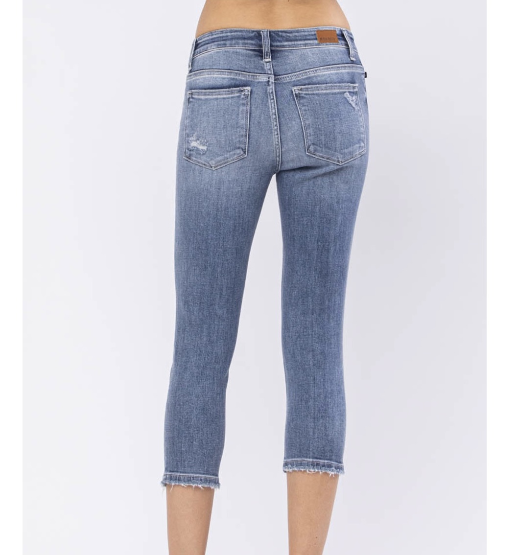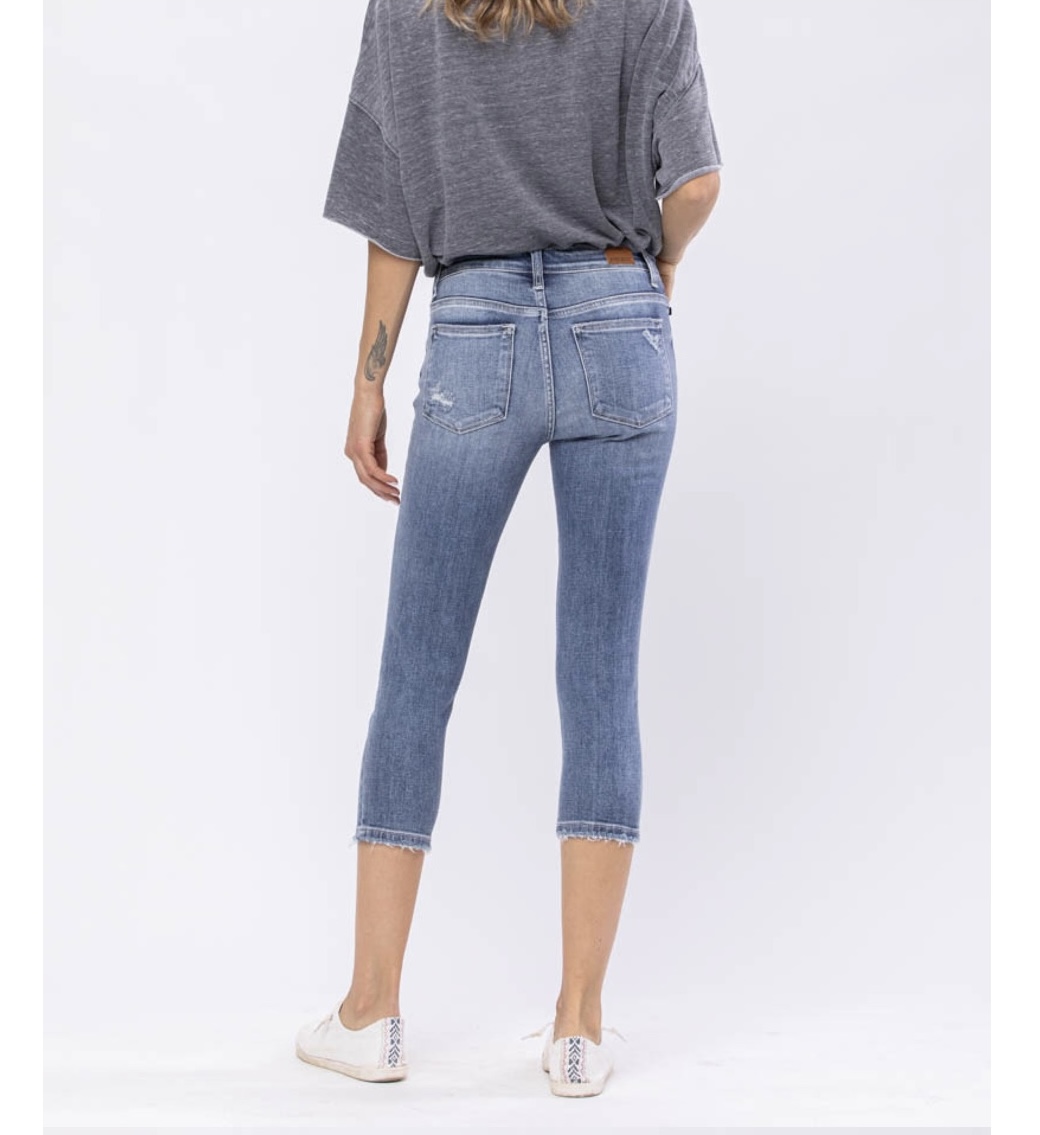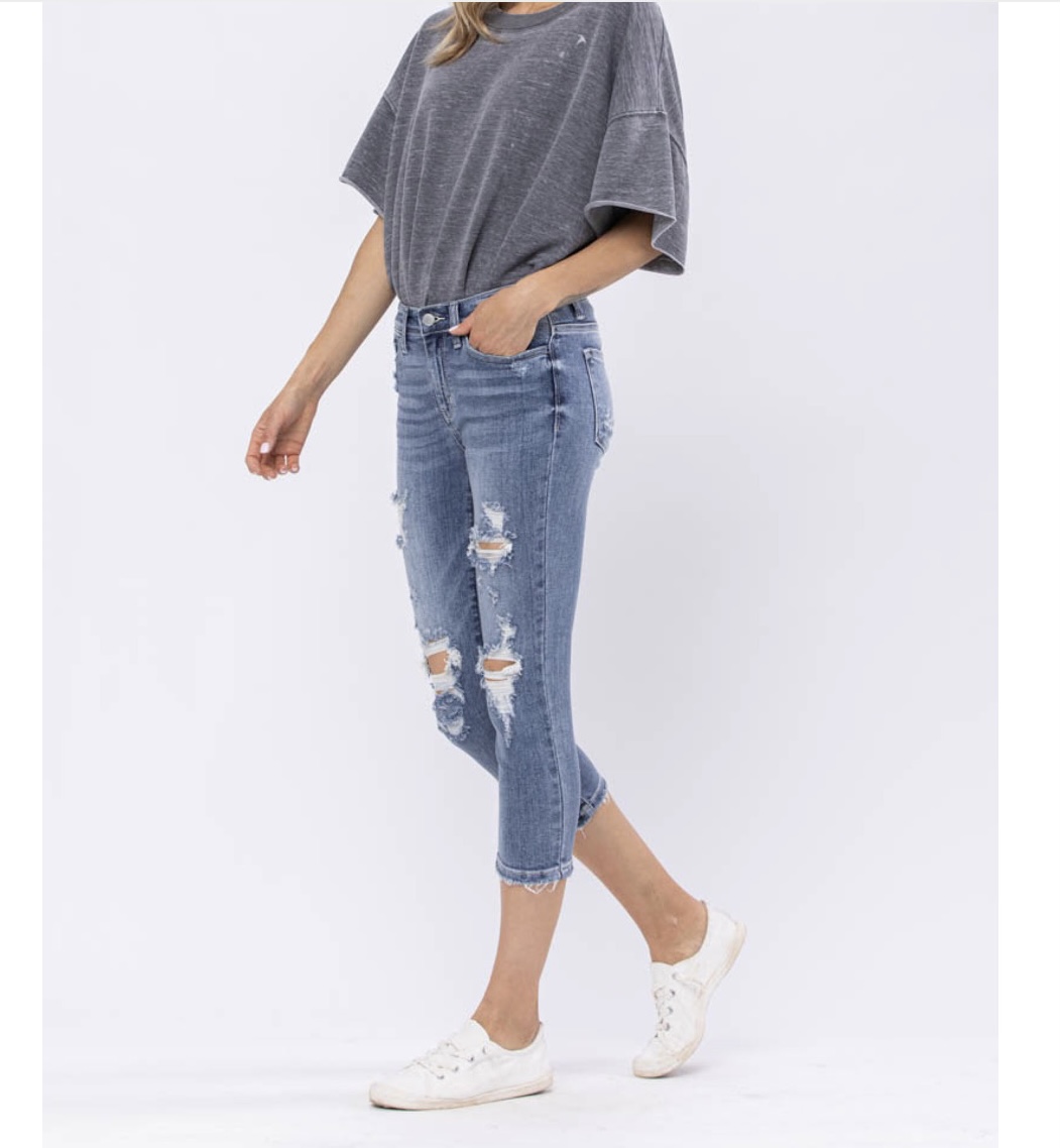 Judy Blue Choose Options JUDY BLUE PLUS SIZE MID-RISE DESTROYED CAPRI MSRP: Was: Now: $64.99 MID-RISE DESTROYED CAPRI 93% COTTON,6% POLYESTER,1% SPANDEX RISE: 9.5" INSEAM: 22” style 82258