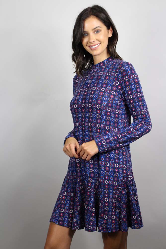 Printed dress with slight pleats at hemline to give this dress a swing look. The keyhole back gives it a modern touch