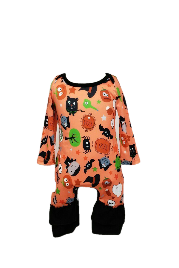 These adorable long sleeve rompers are a perfect boutique style and they have easy access with a snap bottom! Perfect for your littlest trick or treater!
