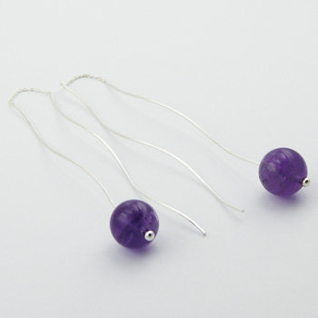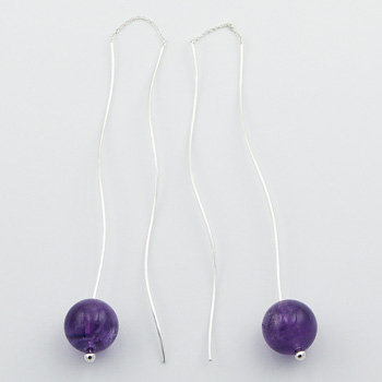 Stunning Threader earrings this time on Sterling Silver wire is threaded through the Amethyst gemstone sphere, fastened with a dainty silver sphere creates a captivating jewelry. Delicate and fine these earrings drop from the chain, nicely curved a flowing silver shining line flanks the features that prominently stages the flamboyant, radiant color of the polished 12mm Amethyst gemstone.