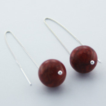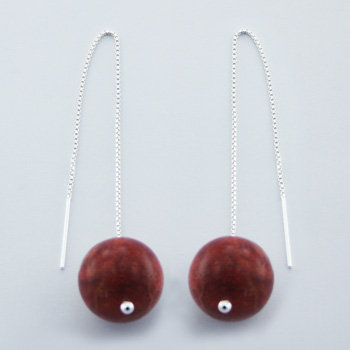 Sterling Silver coral Threader earrings feature smooth, glossy, 16mm red Sponge Coral spheres, glazed with resin, on fine box chains. They make delicate, high fashion Hallmarked 925 silver coral jewelry that embellishes girls and women with a gorgeous style. These are in trend earrings that allow adjusting the height of the sphere, by pulling the chain more to the back or more to front. The Sponge Coral bead is fixed by a tiny semi-sphere at bottom that sets its bright contrast to the warm flamboyant coral. Designed and produced by Planet Silver with uppermost care.