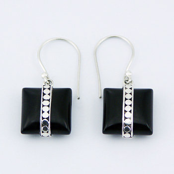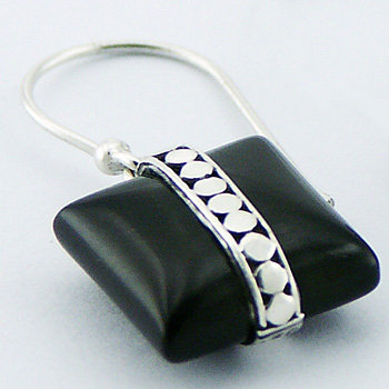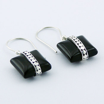 Ornate Sterling Silver gemstone earrings feature square cut Black Agate cabochons that are wrapped vertically in a band of hand soldered Ajoure silver, composed of circles that are placed next to each other, bordered left and right by two silver lines with open space in between, compose highly elegant gemstone Danglers. The intriguing glossy sheen of the Black Agate creates a captivating contrast to the cool, brilliant silver shine. Connected with the welded ring to the swing loops, this adorable handmade silver gemstone jewelry is fit to dress up real ladies!