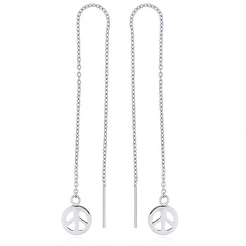 Shiny silver peace symbols are suspended from a length of sterling silver cable chain, which threads completely through piercings and allows one to choose the length by pulling front or back. A small silver post on the opposite end of the chain also easily sways with every movement.