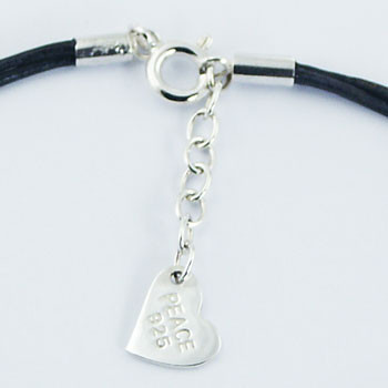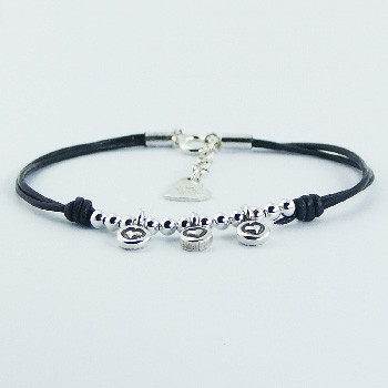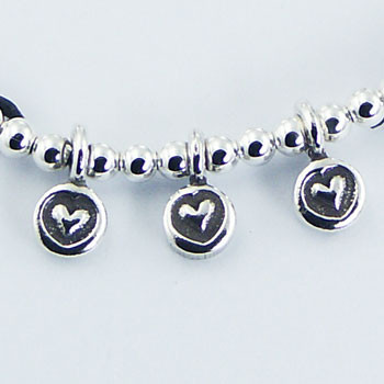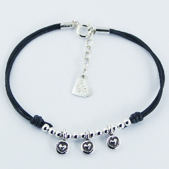 This is a very romantic Leather Bracelet, the three small discs of Sterling Silver with embossed hearts that hang below a row of shiny beads. At the opposite end of the bracelet a clasp with Silver chain ensures that, besides maintaining the bracelet in place, one is also able to adjust its length. High quality Leather Bracelet for female customers of all ages.